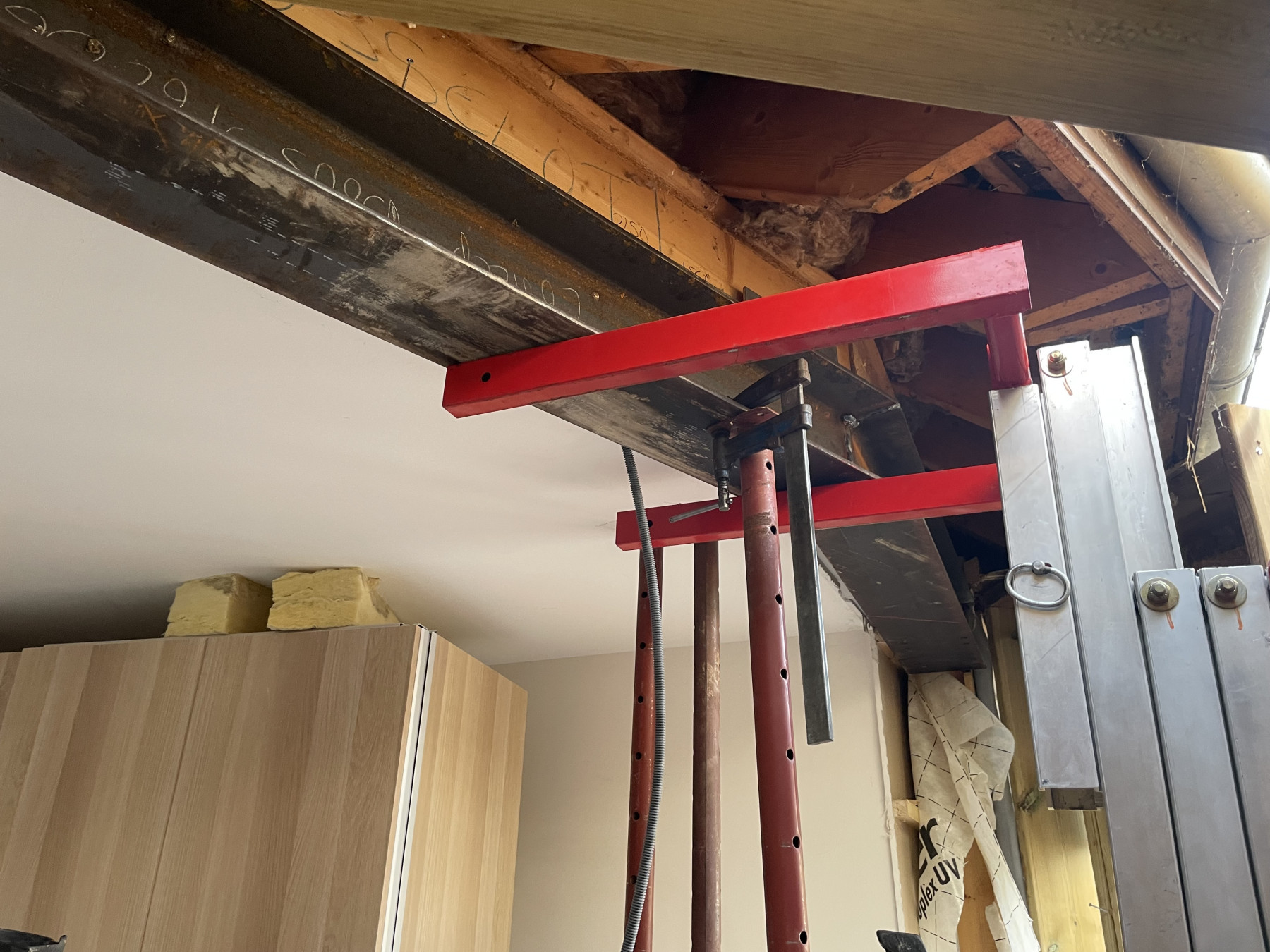 Renforcement de la charpente avec mise en place d’éléments en acier.