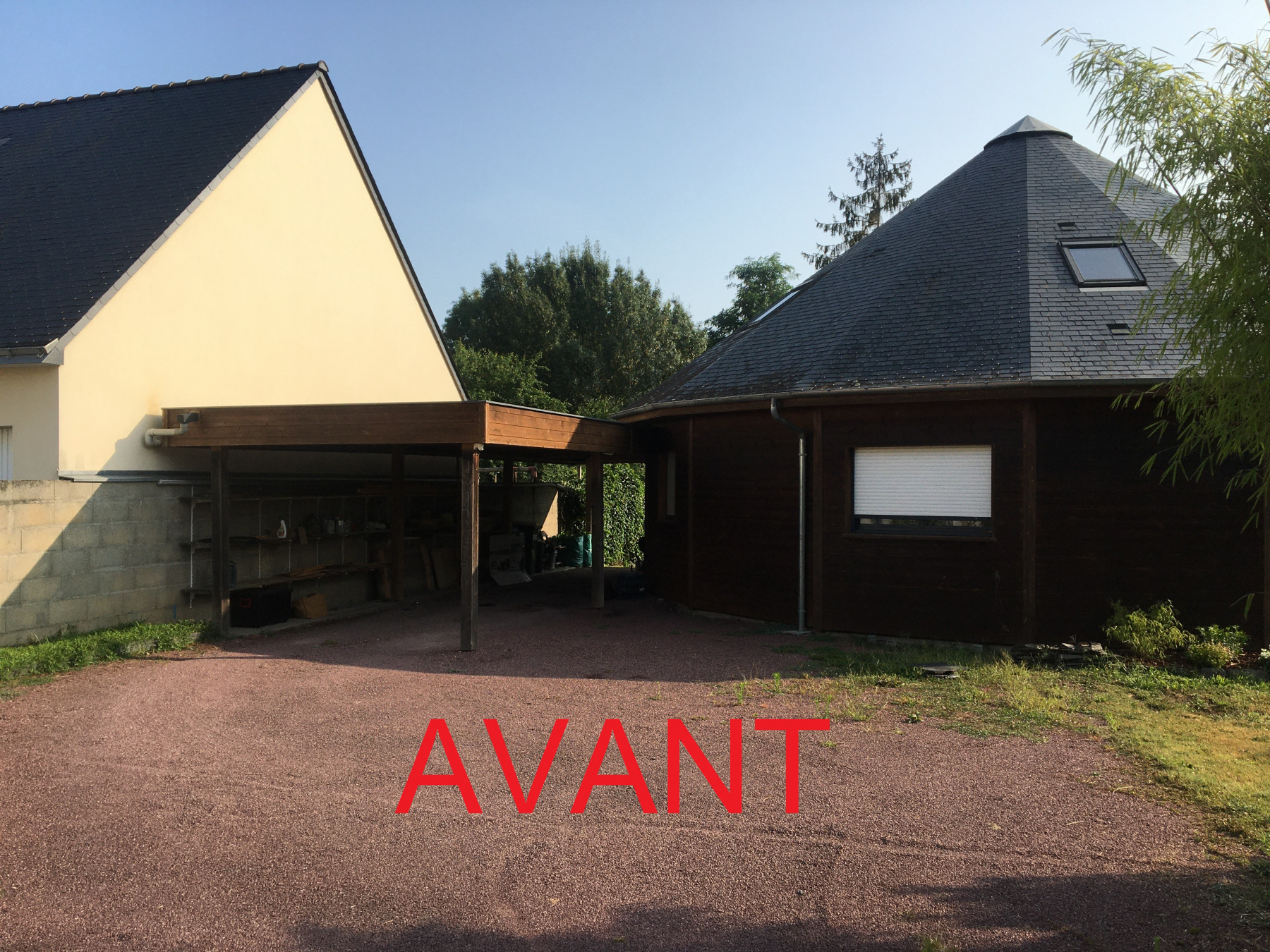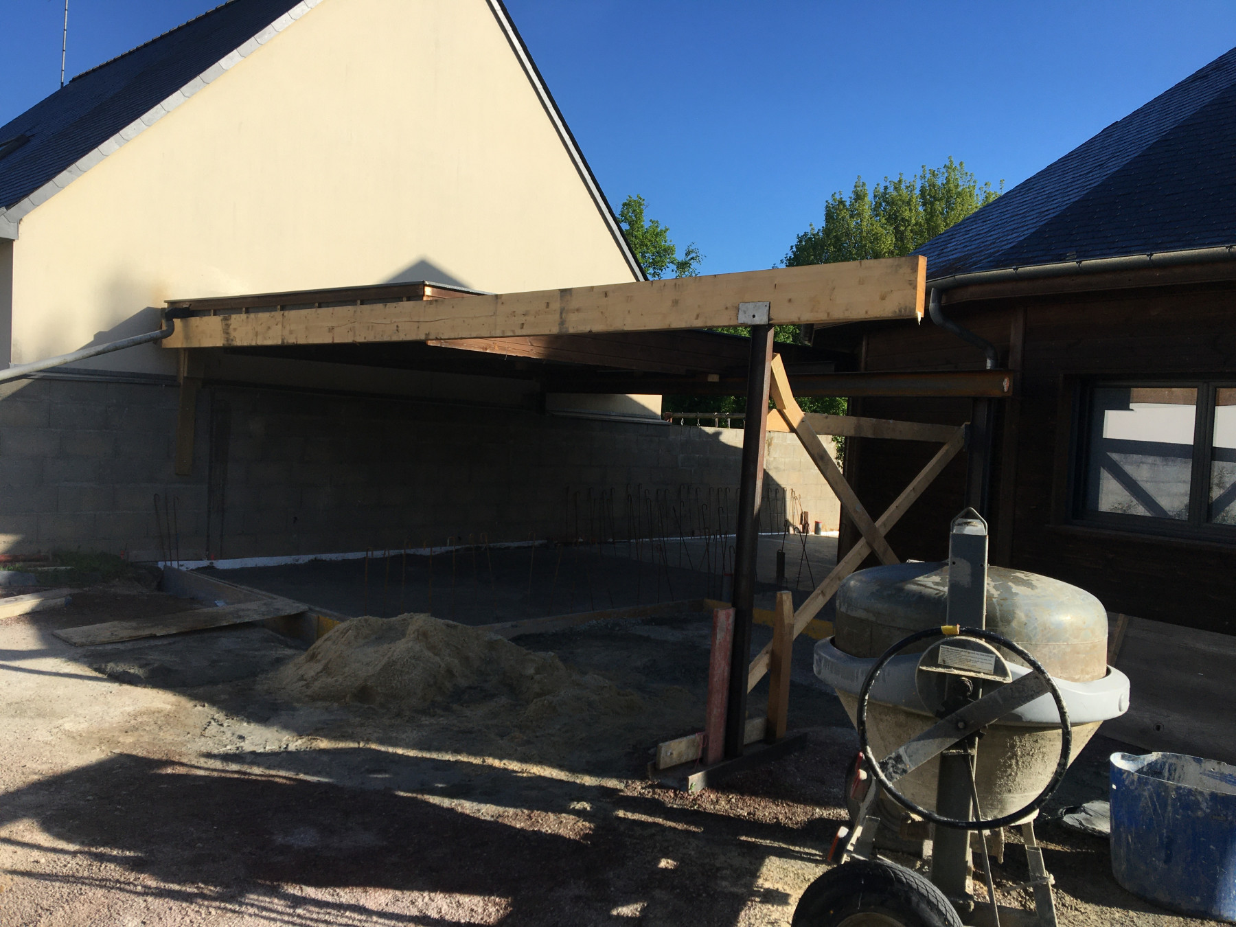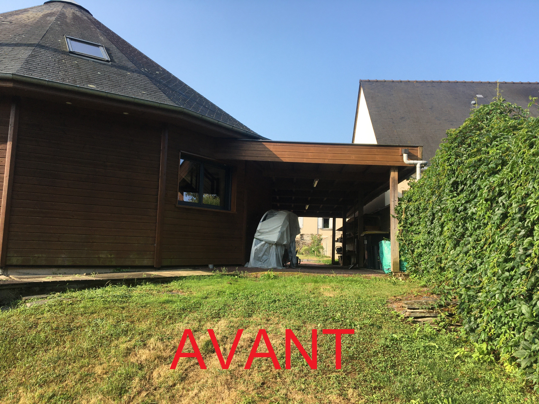 Dépose du carport existant, tout en conservant une partie de sa structure pour l’intégrer au nouvel ensemble.
