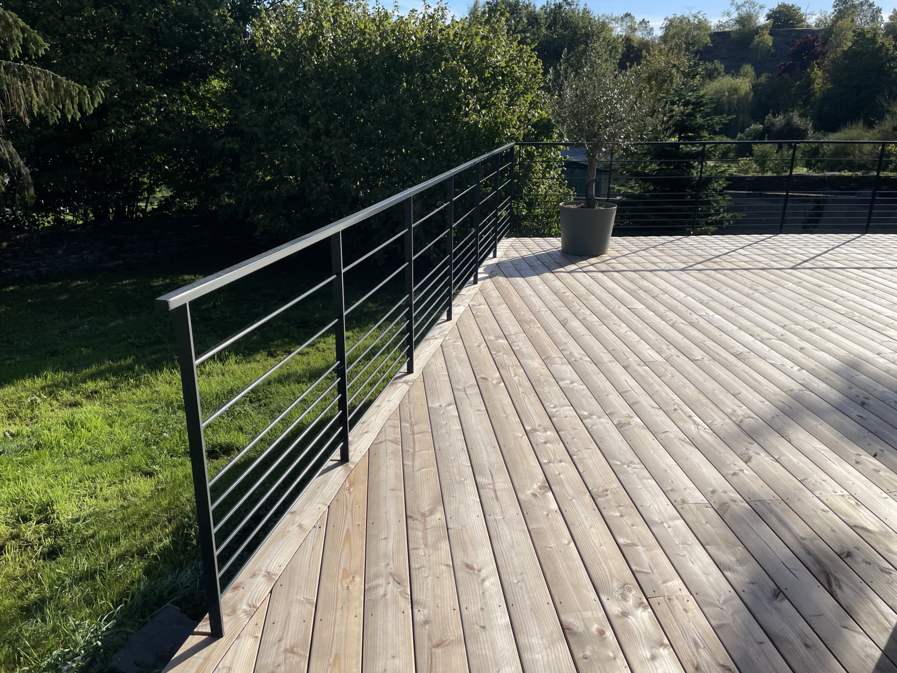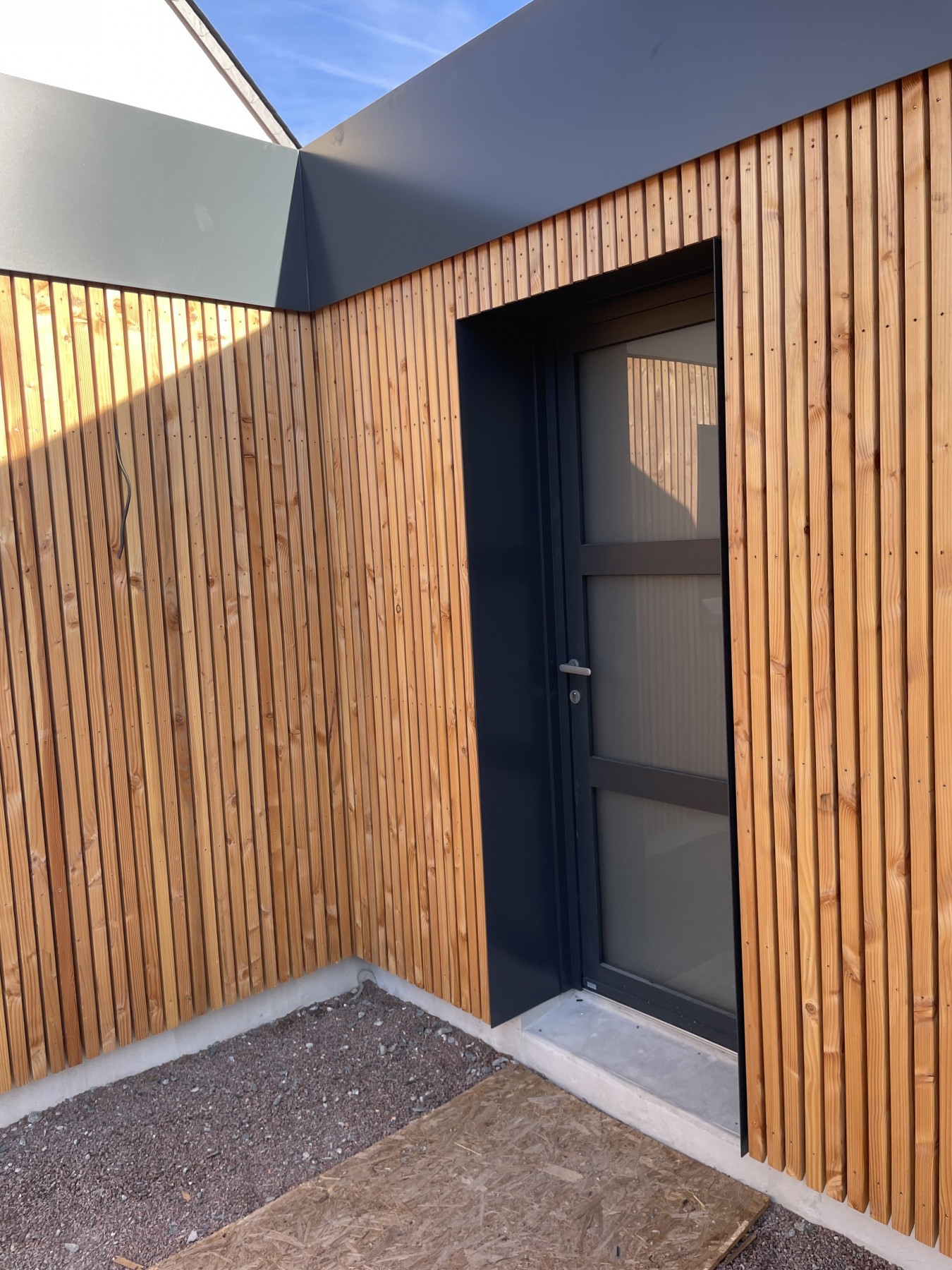 Pose d’un bardage clairvoix, de menuiseries aluminium, ainsi que d’une porte de garage assortie et garde corps acier métallisé.