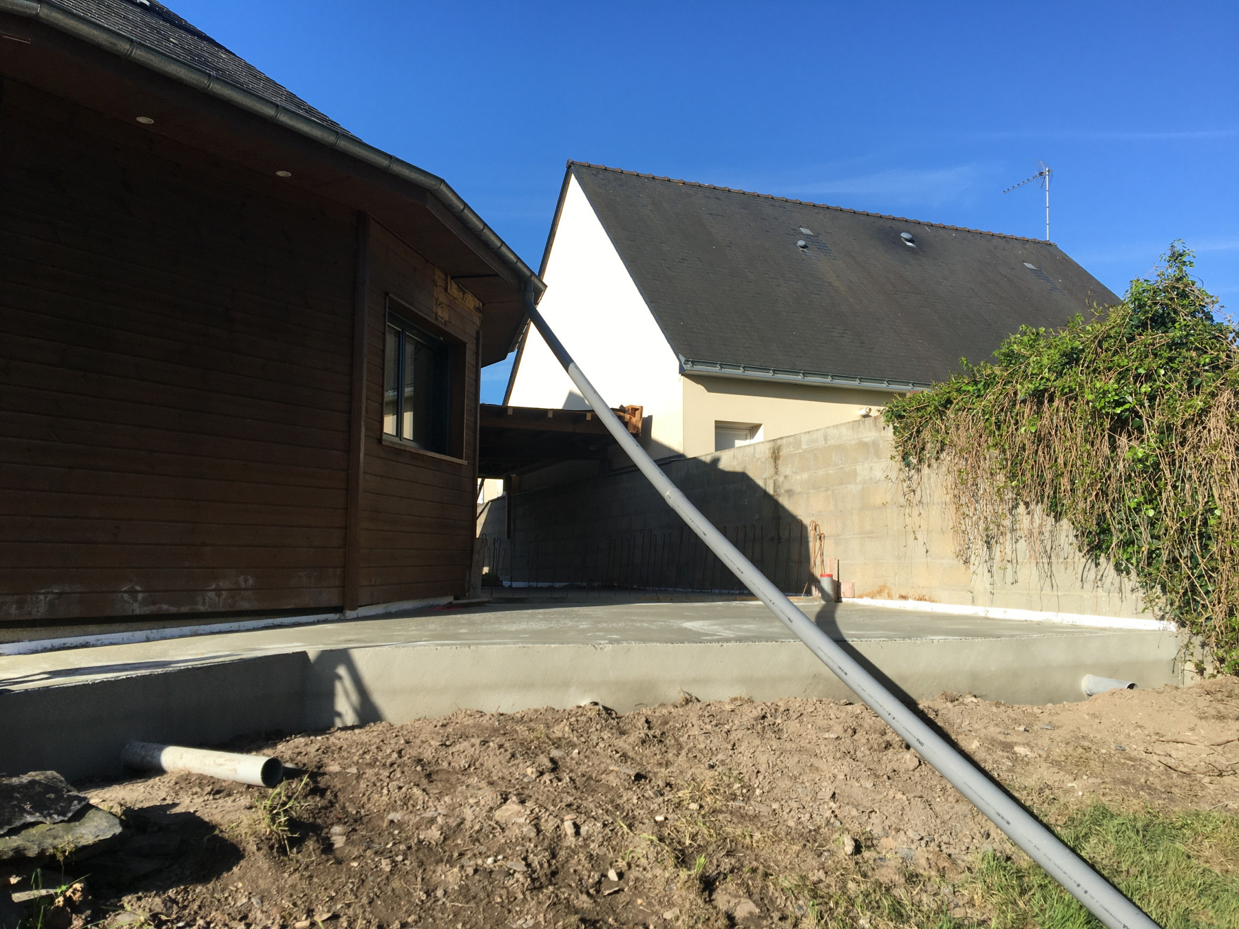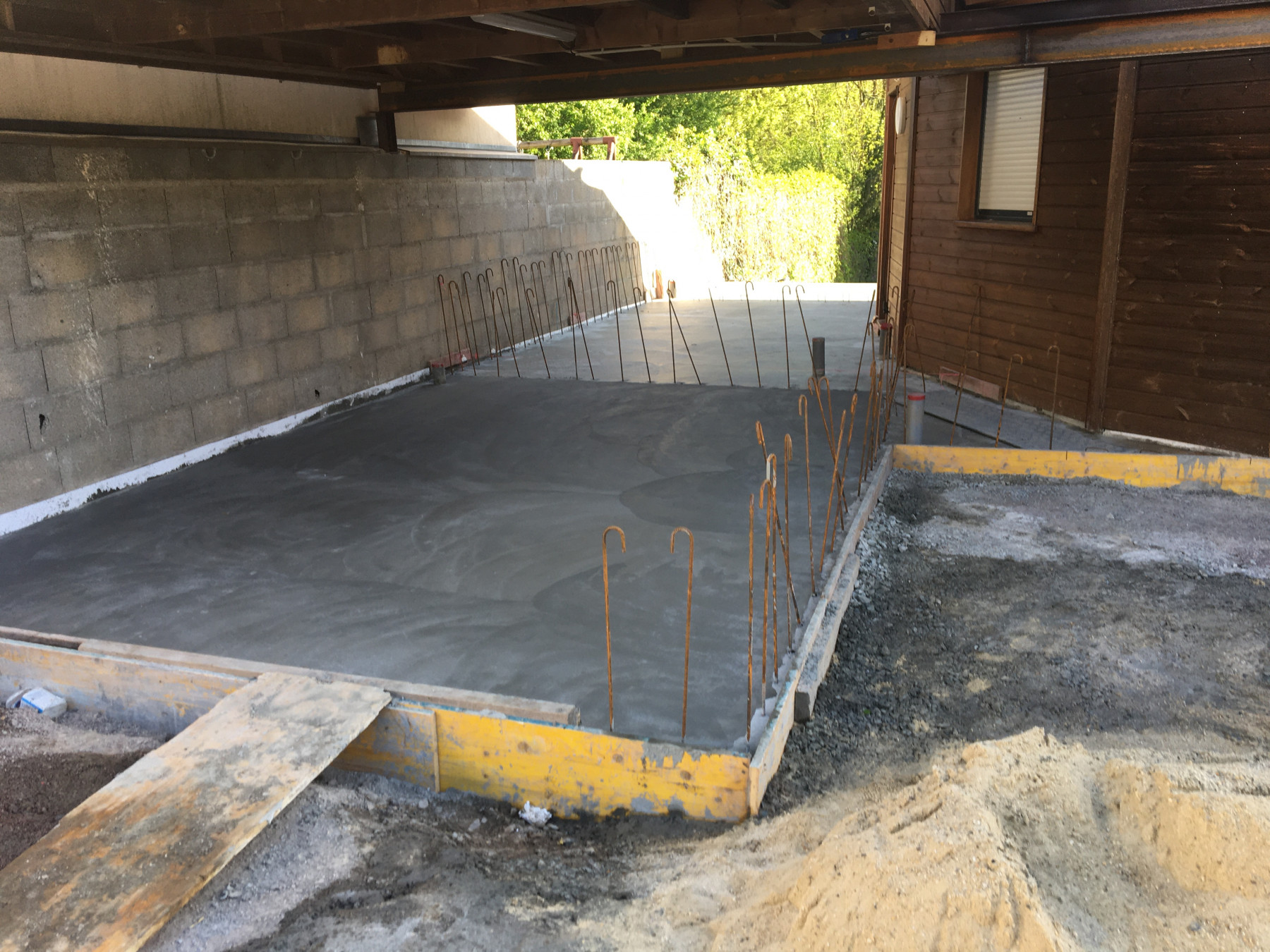 Création d’une nouvelle dalle béton avec fondations, adaptée à la future extension.