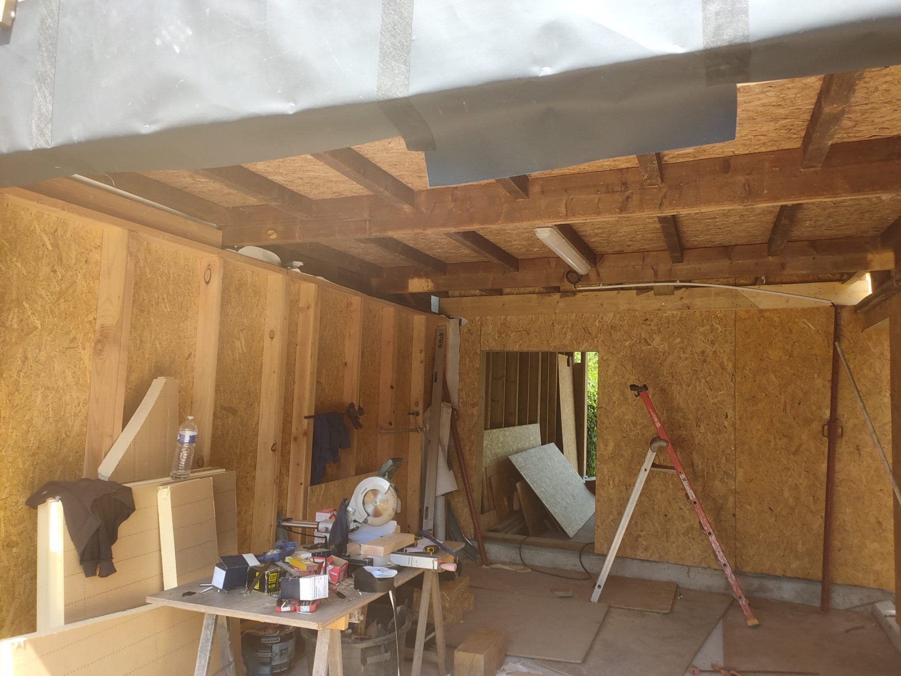 Construction de murs en ossature bois, dont une partie implantée en limite de propriété.