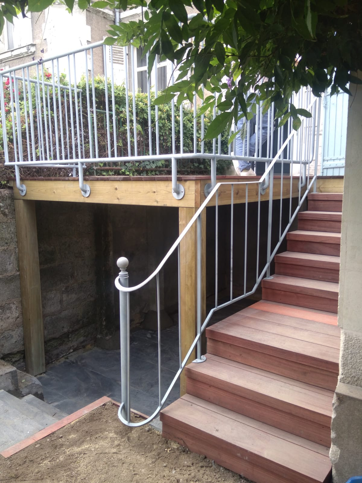 Projet d'une terrasse en centre-ville d'Angers avec démolition et évacuation de l'ancienne terrasse béton existant, structure en bois avec lame de terrasse en bois exotique padouk. Le client souhaitait garder le garde-corps acier existant nous l'avons donc agrandis et sablé métallisé pour qu'il le peigne.